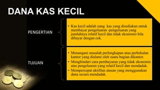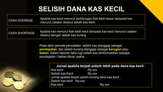 Siswa mampu menyiapkan dan menyusun data maupun informasi keuangan. Dalam sebuah perusahaan adakalanya muncul pengeluaran-pengeluaran mendadak yang tidak terlalu besar nominalnya. Baridwan 2008 menyebutkan bahwa kas adalah alat pertukaran yang dapat diterima untuk pembayaran maupun pelunasan hutang.