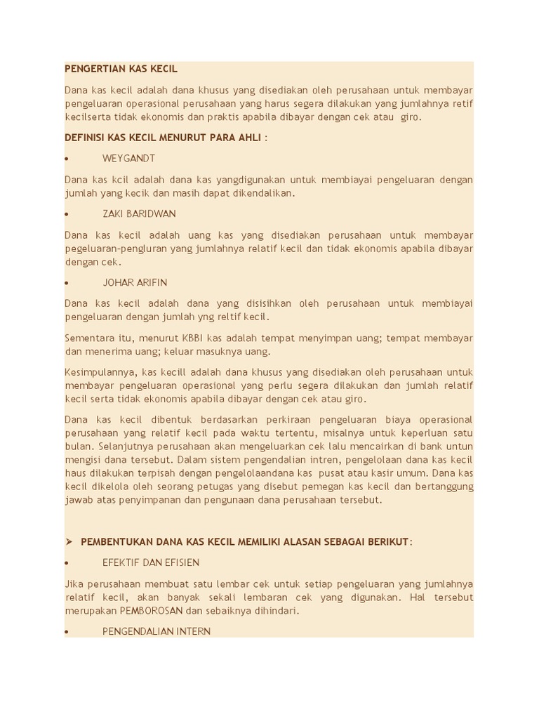 Jumlah petty cash akan bervariasi menurut. Dana kecil digunakan untuk mmebayar tanggungan yang tidak ekonomis dibayar bila menggunakan cek. Pengertian pengeluaran kas menurut para ahli merujuk pada tujuan yang sama.